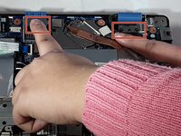 On the right side, locate the piece of clear tape connected to the cooling system (also called a heat sink).