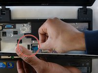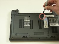 Hold the battery release button, and pull the battery out of the laptop.