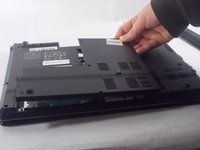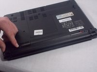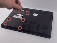 Flip the laptop over and locate the hard drive cover. This is a L shaped plastic cover and has 5 PH#1 8mm screws located around the outside edge. The screw locations are denoted by red circles in the figure.
