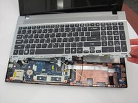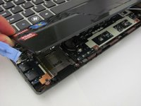 Flip the computer over, and with a spudger, remove the black panel directly below the keyboard.