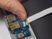 Use your fingernail to remove the plastic white piece that holds the ribbon cable in place. You can remove the cable from either side of the hard drive, but the left side is recommended.