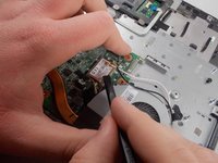 Place the back of the spudger under the black wire that connects the wireless card to the motherboard.