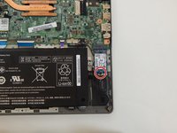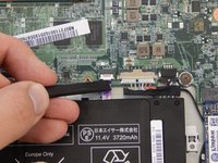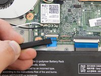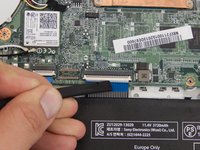 Unplug the black connector attached to the motherboard at the top right of the battery by using a spudger to push the two L-shaped indentations towards the battery.