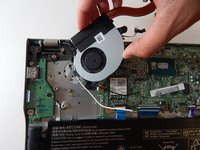 Unplug the white connector attached to the right of the fan with the spudger by applying force towards the battery on the two L-shaped indentations.