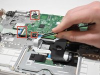 Remove two 4.7mm JIS #1 screws from the black tab on the top right corner of the motherboard.