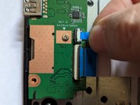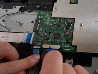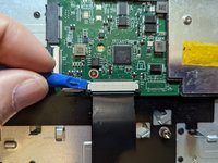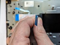 Grasp the ribbon cable by the blue plastic reinforcement and pull the cable straight out to the right.