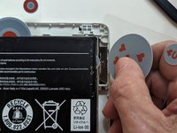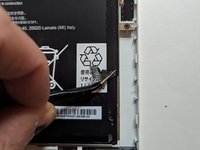 Using a flexible piece of plastic, slip it under the battery and use it to slice the first adhesive strip.