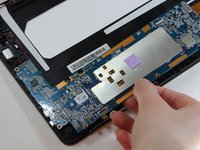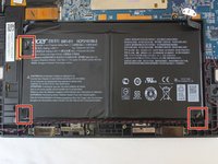 Peel the three shiny black stickers from the battery (top left, bottom right, and bottom left), but keep them attached to the motherboard.