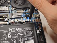 Use your thumb to apply gentle upward pressure on the laptop vent while using a spudger to separate the bottom case from the top case.