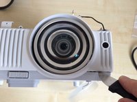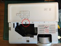 Turn the projector over and remove 5 recessed screws from the holes with arrows against them.