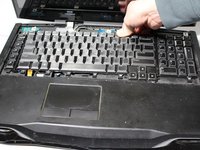 Use the plastic pryer tool to loosen the flat piece surrounding the keys by gently prying it upwards from the laptop's base.