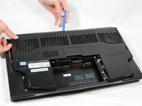 This guide illustrates the steps needed to locate, remove, and replace the CD drive in an Alienware M18x gamer laptop.