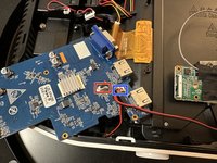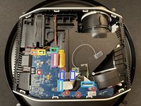• Carefully turn the motherboard over and remove the power button cable (RED) and second fan (BLUE) located on the back. The motherboard can now be removed.