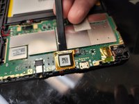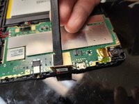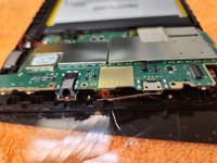 With the adhesive cut and the motherboard released, lift it up and gently work the digitizer connector out of the hole.