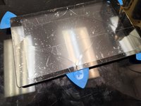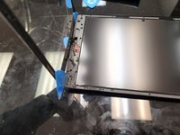 Leave the pick in the bottom left corner and insert a new pick to slice through the adhesive on the left hand side.