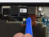 • Once you see the sharp corner of the copper strip, use a spudger to lift it off of the camera housing. Under the strip will be another connector cover in a small piece of black tape. Follow the steps from step 5 to remove the cable from this connection.