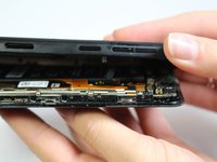 Using the opening tool, disconnect the volume rocker ribbon cable from the base of the phone freeing the two halves of the phone.