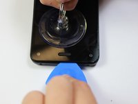 While lifting up on the suction cup insert an opening pick into the crevice between the screen and back casing to pry the screen off carefully.