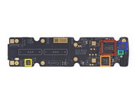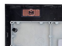 • Keeping cool under the HDMI port, we find a little antenna, chilling all alone, not tied back into the system. With a tiny chip in the center, this looks like an RFID sticker, probably for inventory or tracking during manufacturing.