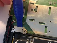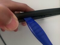 Fit the tip of the plastic opening tool under the bottom right of the battery.