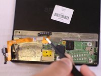 Using the metal spudger, tweezers, and your finger tips, gently lift the orange power bridge connector off of the motherboard first and then off of the kindle.