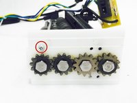Remove the washer from the gear second from the right using two metal spudgers. Place one spudger on each of the open ends of the washer. Push down with both spudgers at the same time to pop the washer off the gear.