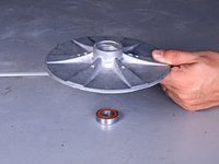 Place a 15/16" socket inside the center of the sanding disc and use a mallet to tap the bearing out of the disc.