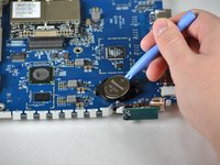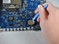 The battery is secured to the reverse side of the logic board when opening the device from the bottom. The back pad and outer case must be removed before replacing the battery. Use a non-metallic tool to remove the battery.