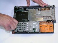 With the keyboard turned over as pictured, carefully remove its ribbon cable from the connection port on the logic board. Use the spudger tool to lift the white plastic retainer about 1/16" to release the cable.