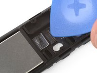 Insert an angled probe into the housing to release the right plastic clip of the mute button.