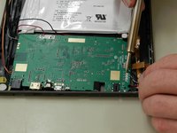 Remove the black tape from the silver cable connecting the screen to the motherboard on the left side of the tablet.