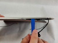 Wedge an opening tool or spudger between the keyboard (upper case) and the lower case of the bottom portion of the Chromebook.