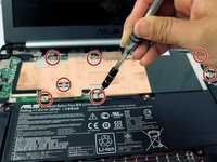 Use a J0 Phillips screwdriver to remove the 5, 4mm silver battery screws from the battery.