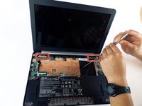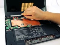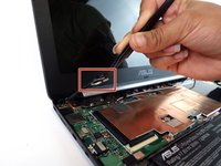 Locate the LCD cable and its connector which is located in the upper left hand corner of the computer. Carefully flip up the tiny tab and safely remove the cable using precision tweezers.