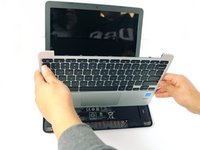 Turn the laptop on its side. Use a small, blue opening tool to pry the keyboard cover and laptop apart. Begin from the top right, next to the power button, and slowly work your way around to the opposite side until the keyboard cover is detached.