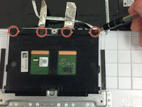 Lift the foil strips to reveal two hidden screws. Then remove all four 2mm screws from the top of the trackpad with the Phillips #1 screwdriver.