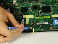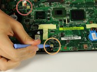 Use the plastic opening tool or your hand to carefully lift the left hand side of the motherboard away from the bottom plastic casing.