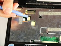 Remove the cord, on the upper left of the keyboard housing, from the connection point using the plastic opening tool. Place the plastic opening tool on one end of the white plastic piece. Pull on the edge of the piece to remove it from the connection housing.