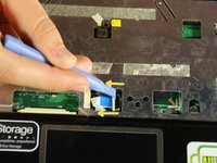 Run the plastic opening tool along the side of the netbook while lifting upwards, keeping it wedged between the two black pieces. This will loosen the connection.