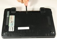 Wedge the plastic opening tool between the two black layers of the netbook. There is a visible line that divides the bottom and top black pieces.