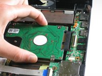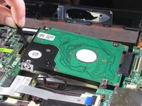 Gently pull the hard drive to the left by the black plastic ribbon. Slowly lift the hard drive up on the left and then out.