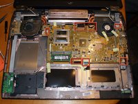 And here are the inner workings, laid bare at last. Note the two dual heatpipes, very necessary for a machine of this type. Feel free to remove than fourth RAM module you couldn't get to earlier. The boxes indicate motherboard connections to disconnect.The two with black cables have a thin layer of plastic adhesive holding them in place. Pull this up and pull the connector straight out.