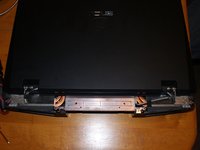 When the screws are removed, gently pull the LCD panel up, then rotate it back so that it lays flat. Take care not to place undue stress of the cables still connecting it to the rest of the laptop.