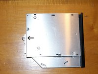 Indicated by the white arrow is the screw to remove to allow you to pull the optical drive. Also visible beneath the screw hole is a silver tab. Push this to the right to get a grip on the drive door and pull it the rest of the way out. When the drive is removes, put the screw back in the hole in the drive, to keep track of it.