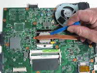 Detach the fan from the motherboard. The fan is attached to the motherboard with a light layer of thermal paste, requiring a prying tool to loosen the adhesive.