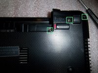 Start by removing the battery and 2 Ph0 screws indicated here, then slide the cover to access hard drive, RAM modules and Wi-Fi card.