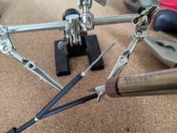 soldering iron, soldering thread, heat shrink tubing, and helping hands