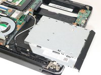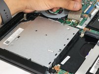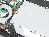Lift up the sticker that sticks between the motherboard and the optical drive. Then, unscrew the one screw where it is marked and slide it out gently.