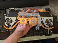 Marked in yellow are the power and signal wires for the fans. Using a plastic spudger slowly walk the male plug out of its socket.