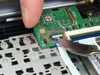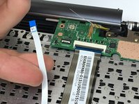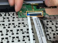 Use a spudger to carefully flip up the black tab on the ZIF connector and pull the black striped ribbon cable away from the motherboard.